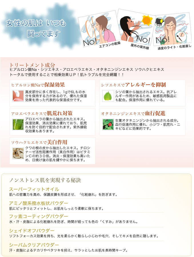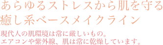 現代人の肌環境は常に厳しいもの。一年中、エアコンなどの空調設備により、肌は常に乾燥しています。紫外線や一日何度も繰り返される化粧直しもその一つ。常に肌にまつわるストレスに、女性の肌は脅かされています。 そんなストレスから肌を守り、しかも癒してくれるベースメイクラインはMIKIYAにおまかせ。一日中、崩れない『ノンストレス肌』へ、あなたを導きます。